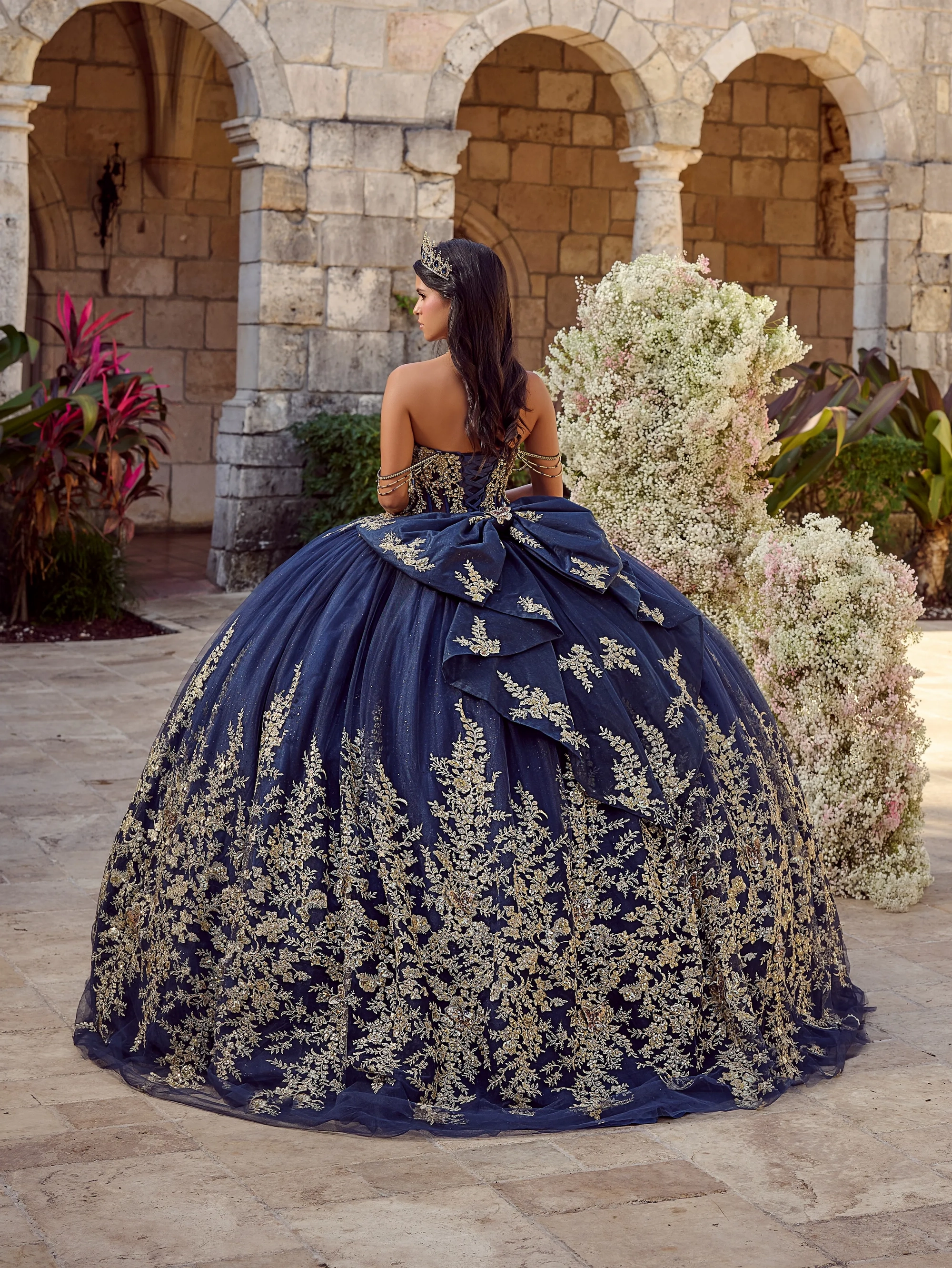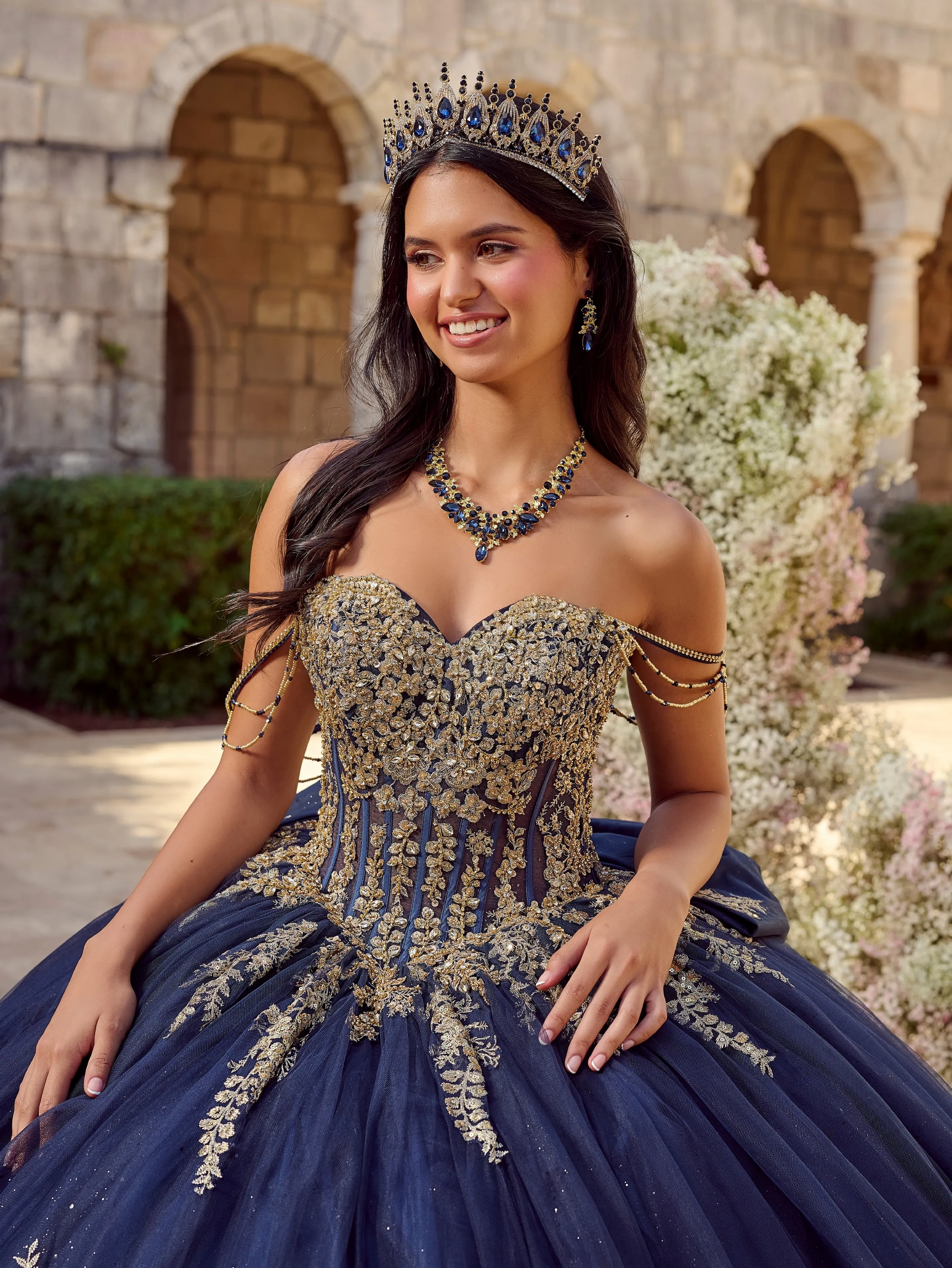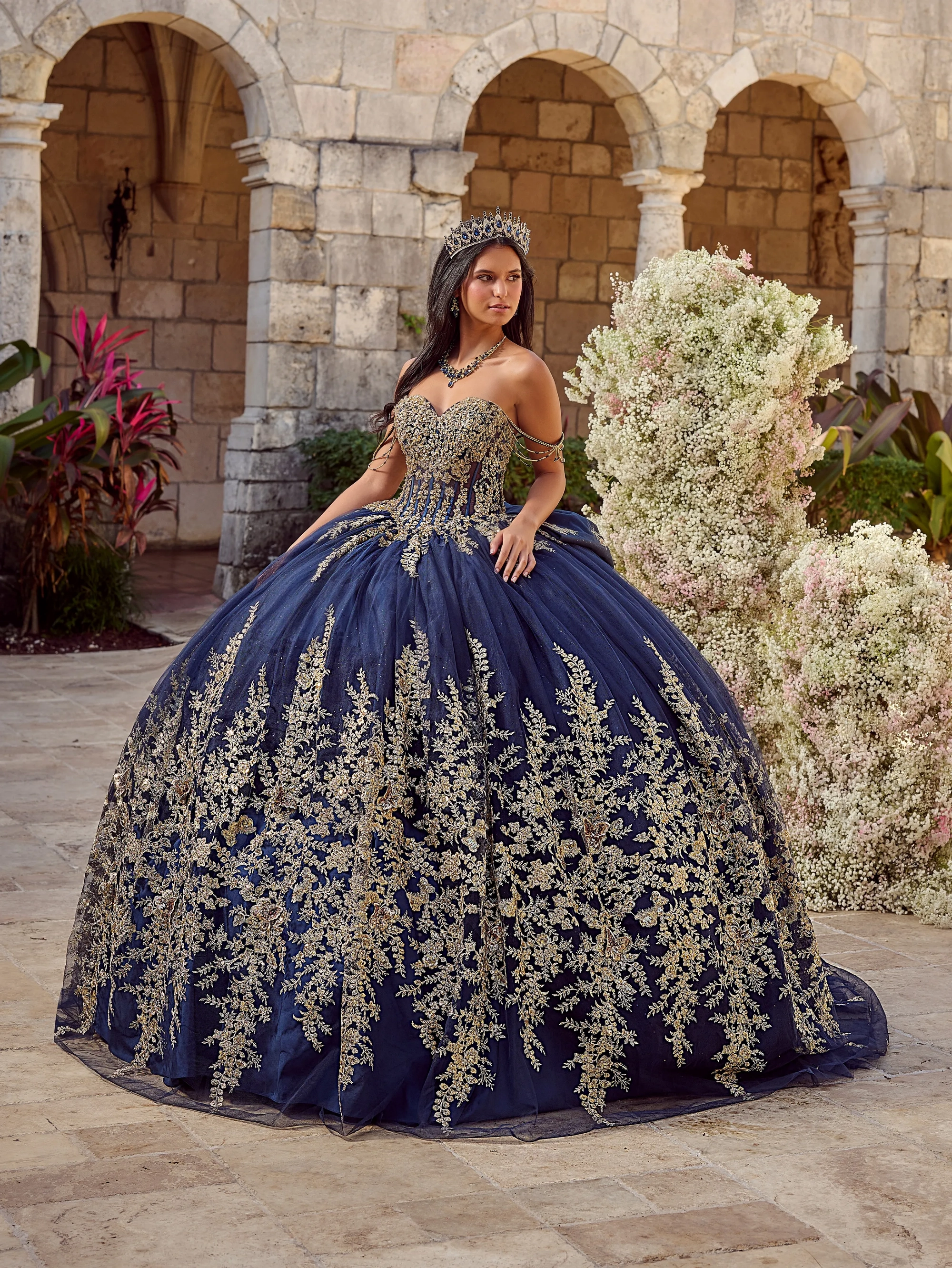 Regal and dramatic, this navy and gold ball gown captivates with a corset bodice, off-the-shoulder draped chains, removable bow and lavish metallic embroidery. Layers of glittering tulle create a breathtaking silhouette, perfect for a queen-worthy entrance. Tulle/Glitter Tulle