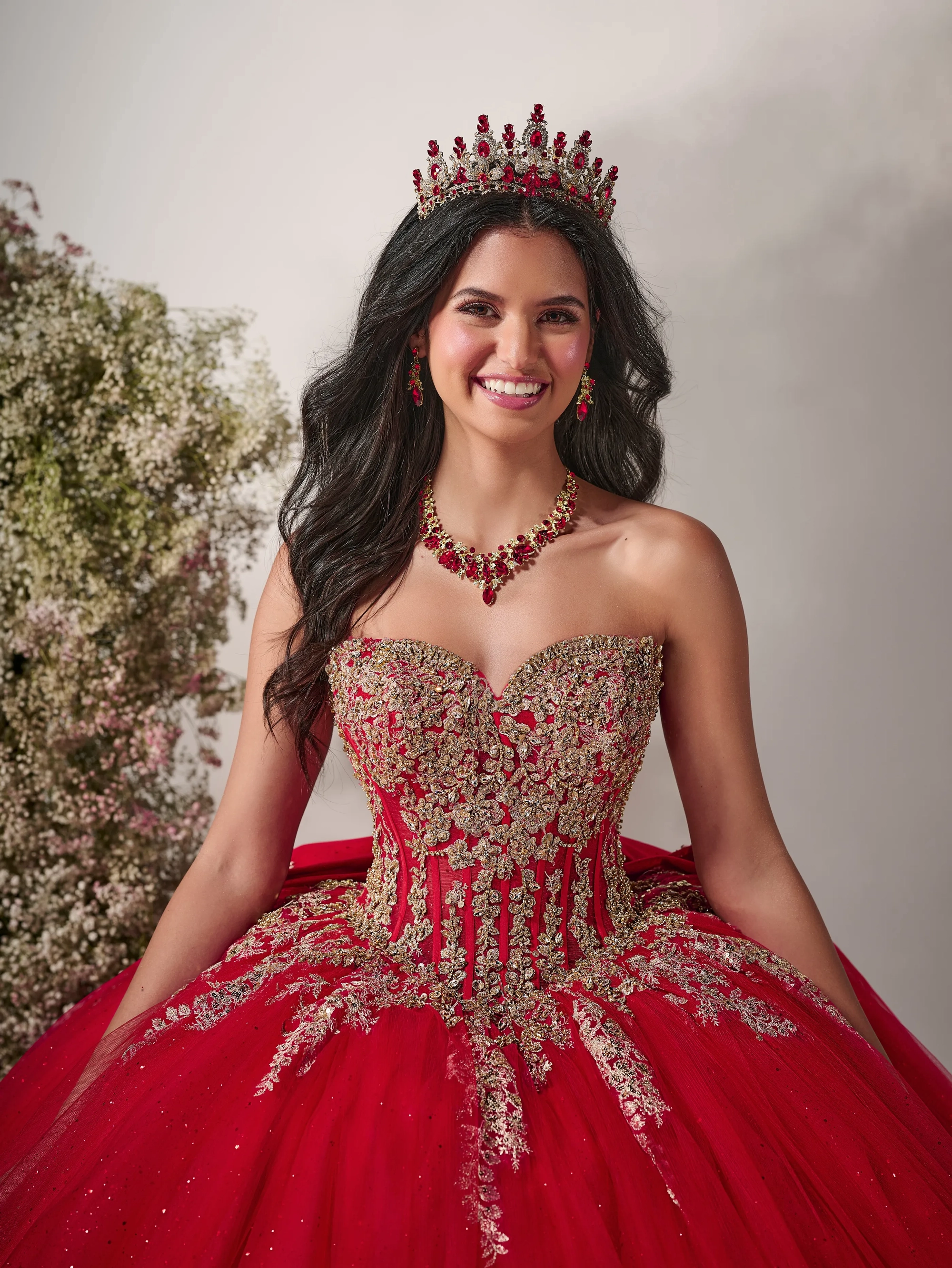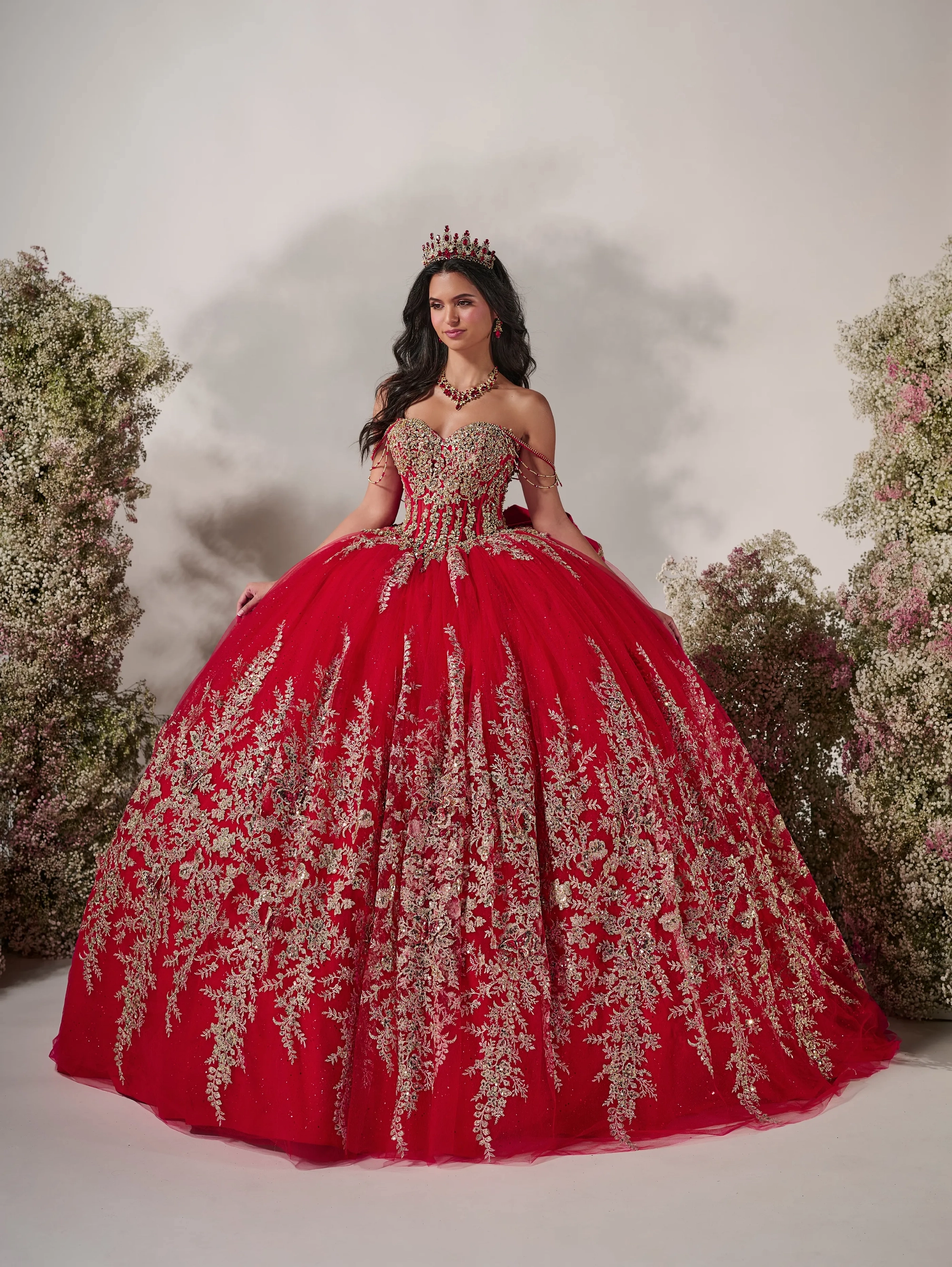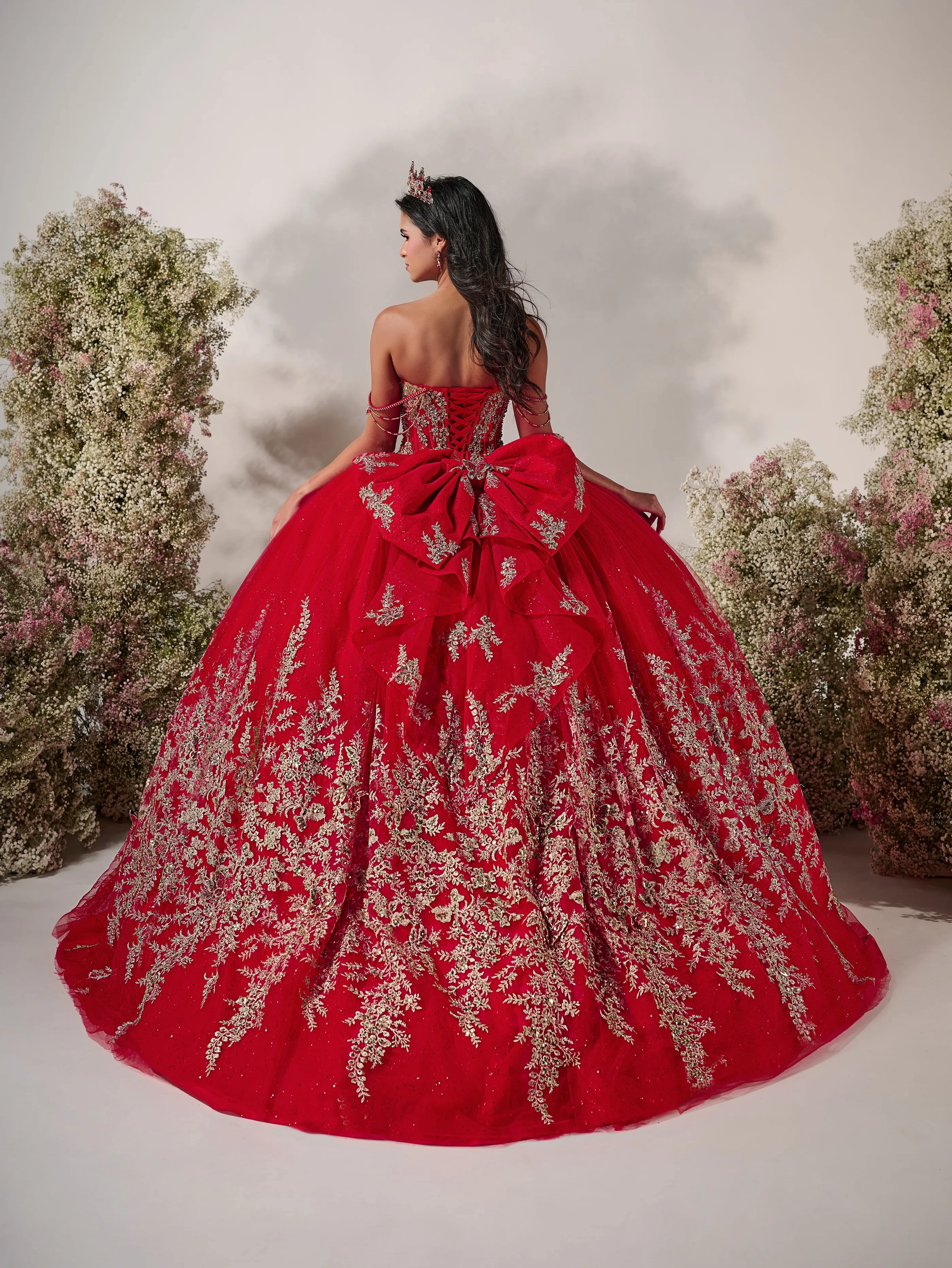 Regal and dramatic, this navy and gold ball gown captivates with a corset bodice, off-the-shoulder draped chains, removable bow and lavish metallic embroidery. Layers of glittering tulle create a breathtaking silhouette, perfect for a queen-worthy entrance. Tulle/Glitter Tulle