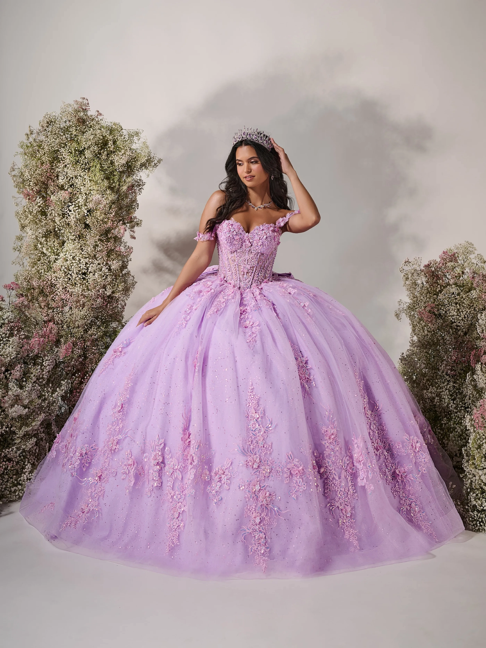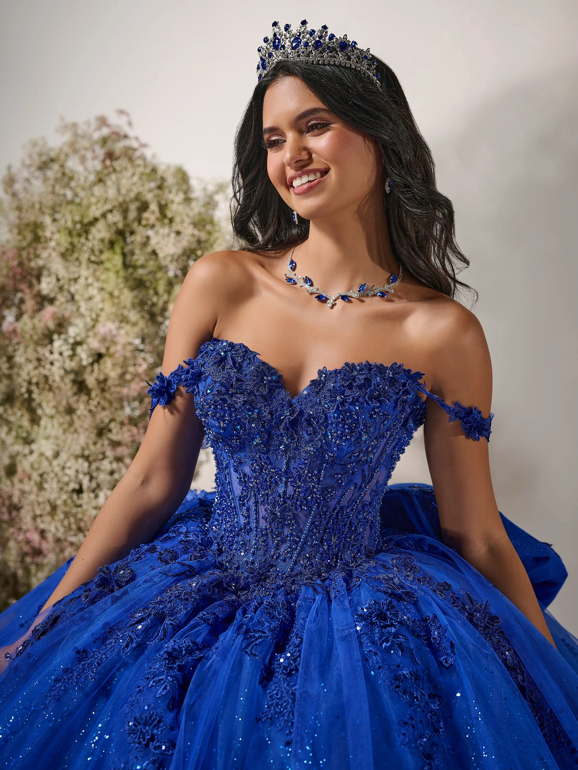 Turn heads in this enchanting ball gown, designed with a delicate sweetheart neckline, off-the-shoulder floral straps, and a structured corset bodice for a flawless fit. The shimmering glitter tulle skirt, adorned with cascading embroidered appliqués, is complemented by an oversized detachable bow for a dramatic and elegant finishing touch. Tulle/Glitter Tulle