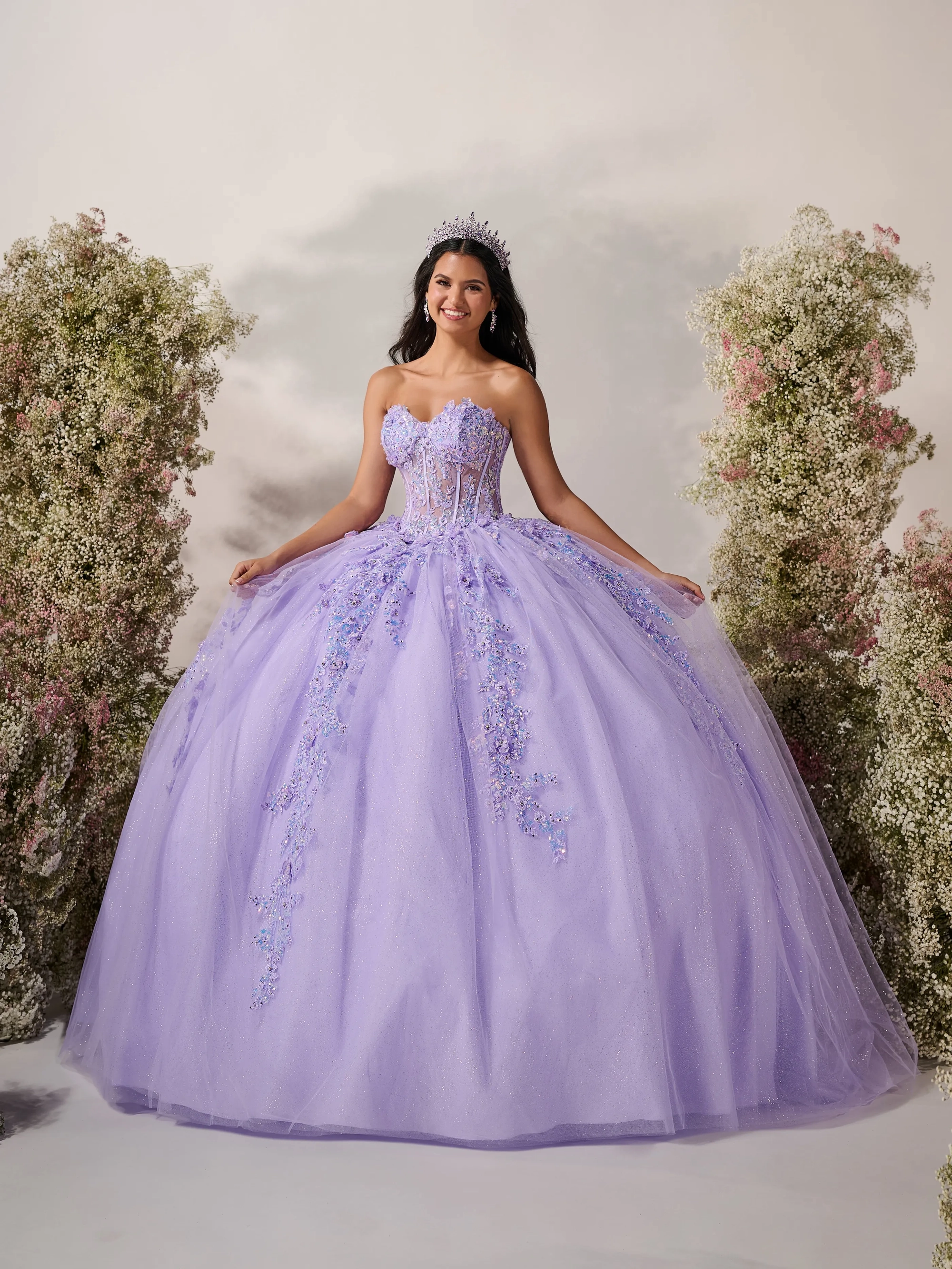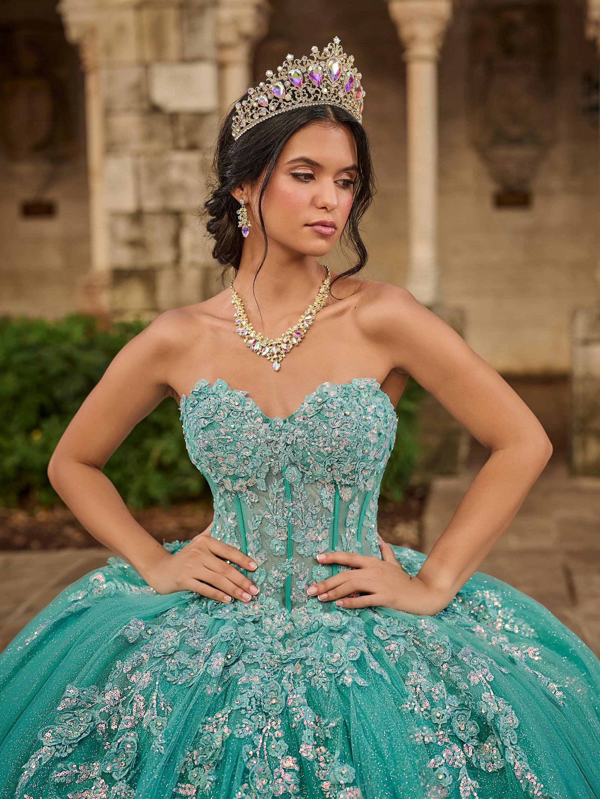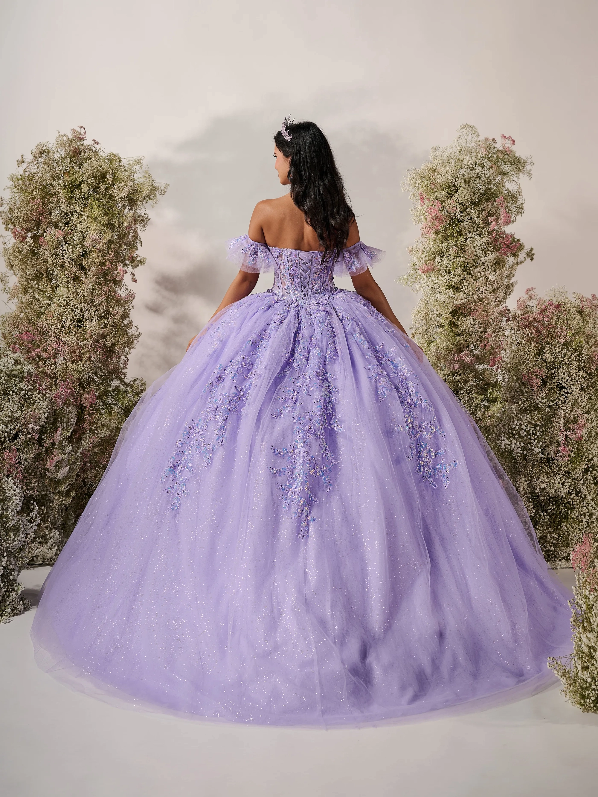 Make a grand entrance in this exquisite off-the-shoulder ball gown, featuring a structured corset bodice adorned with shimmering floral appliqués. The voluminous sparkle tulle skirt cascades beautifully, while the detachable sleeves offer versatility for a custom look. Sparkle Tulle/Tulle