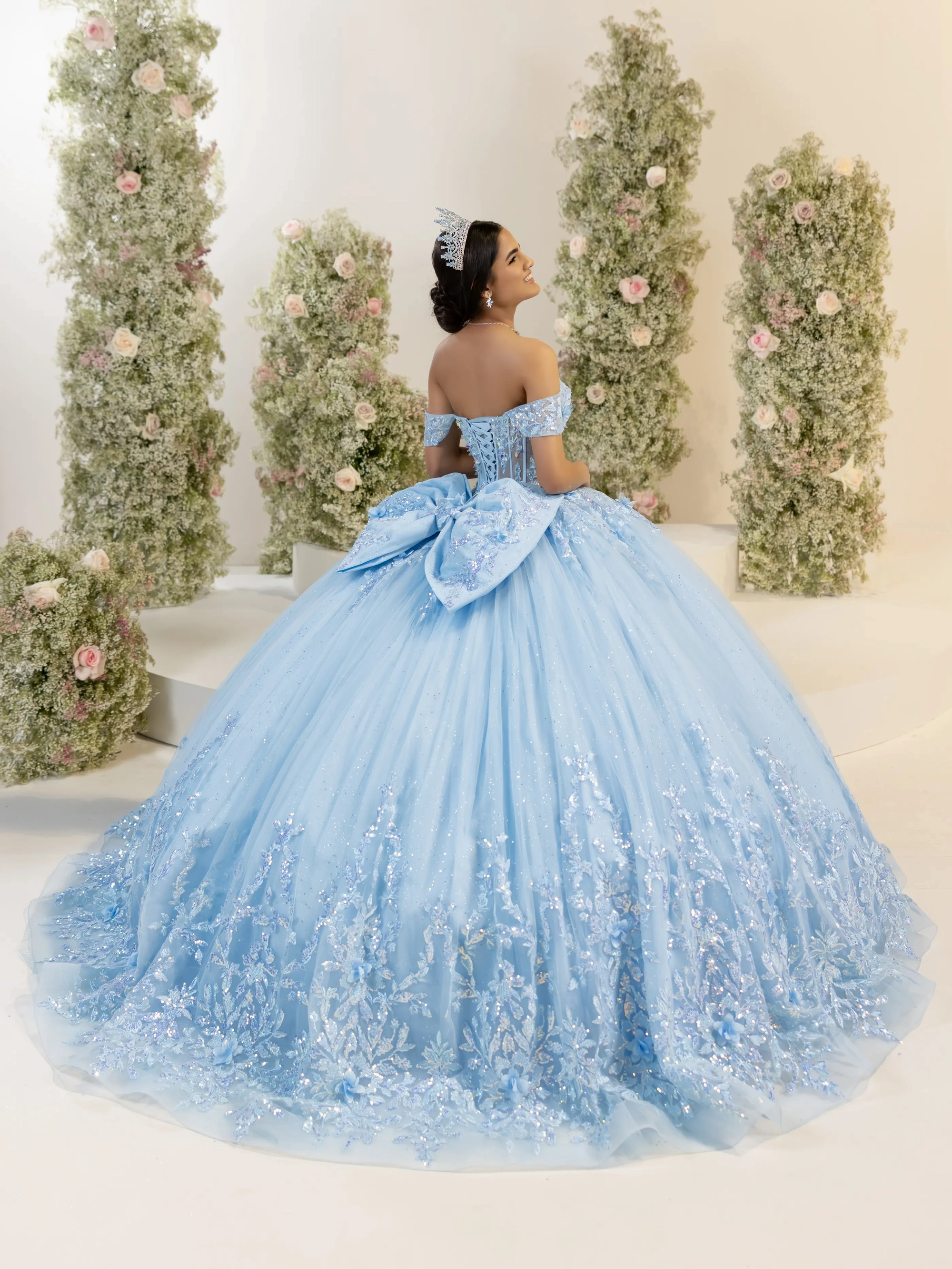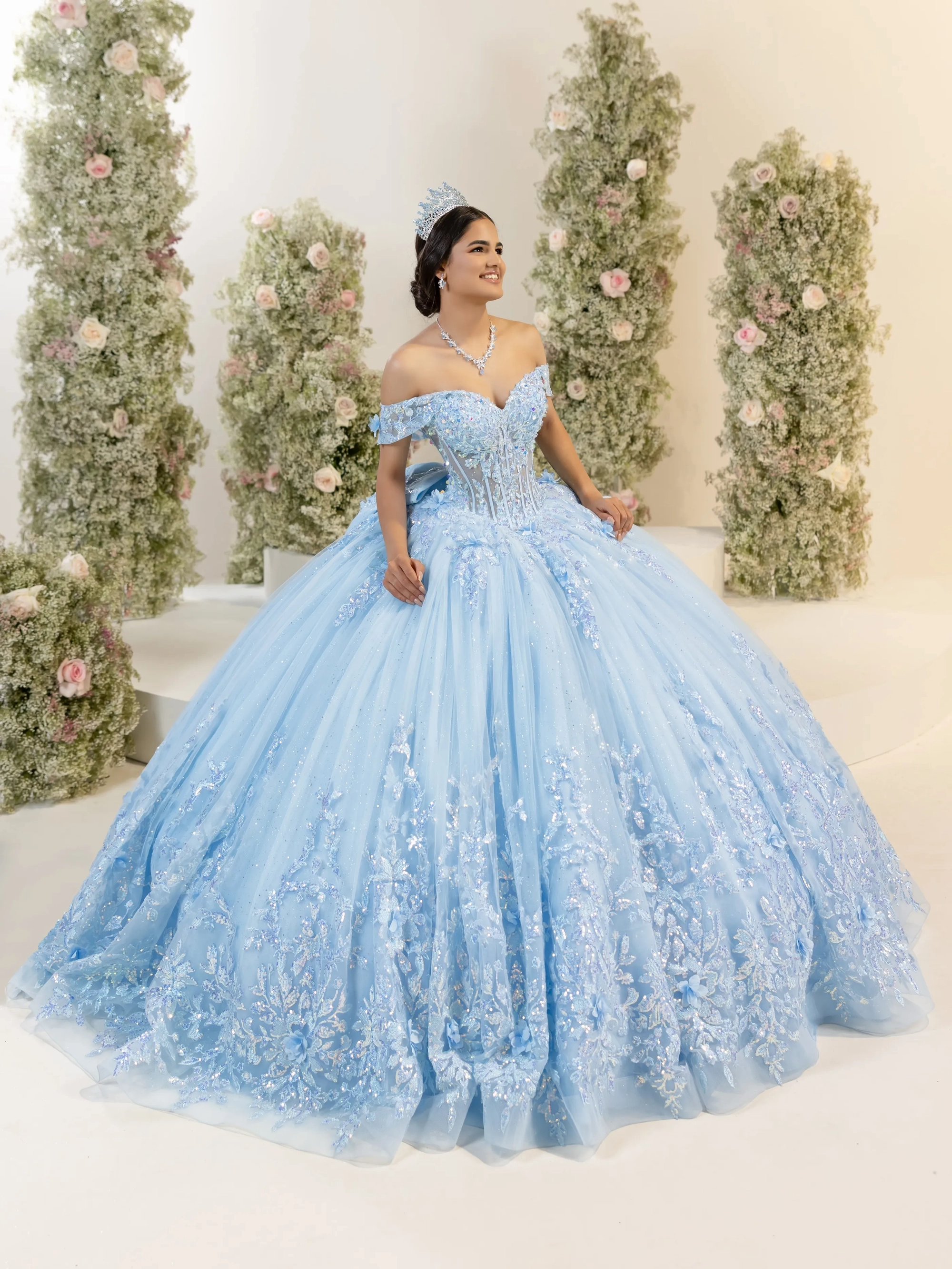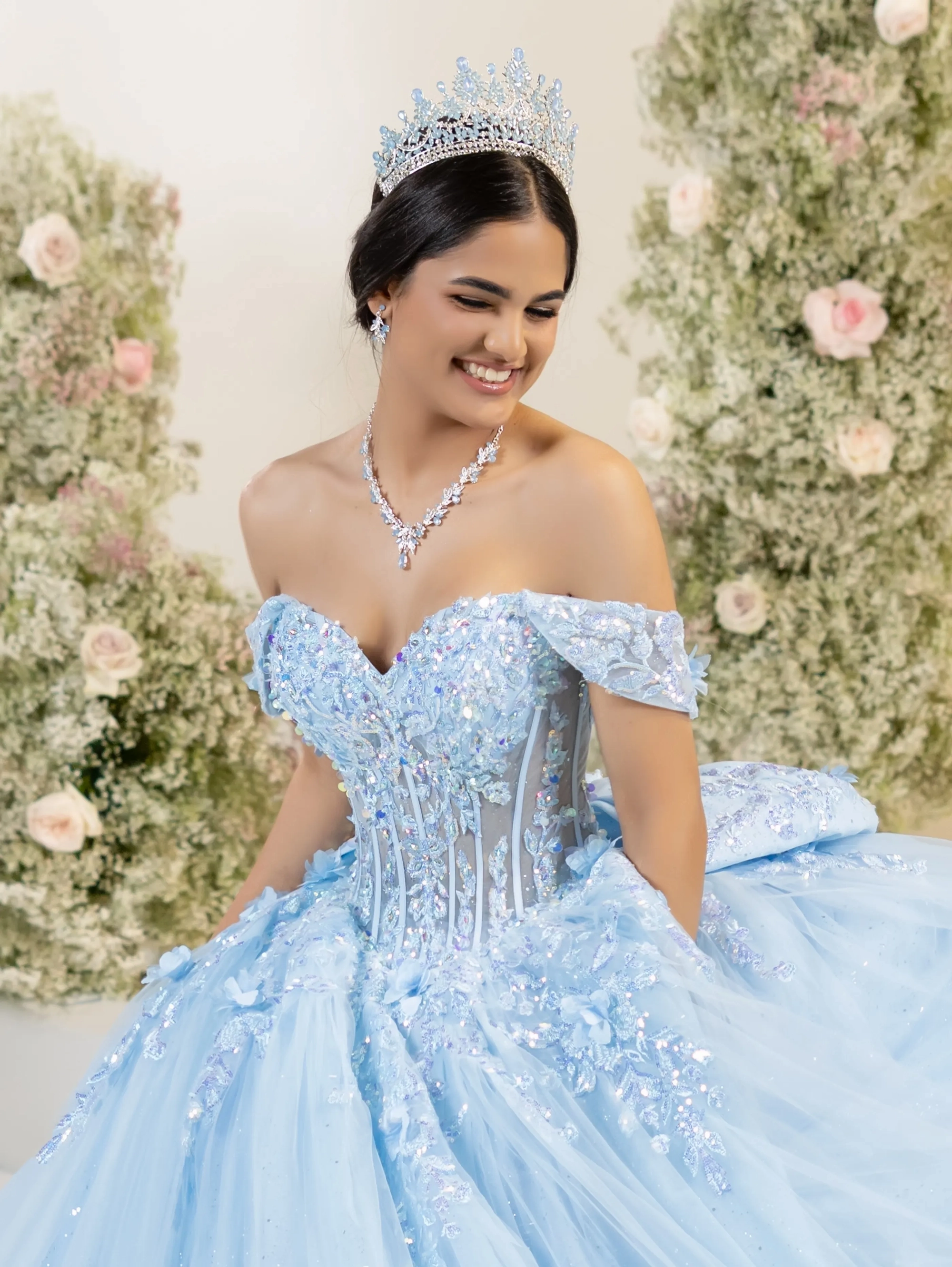 Off-the-shoulder sweetheart neckline adorned with 3D embroidery lace and fitted corset-style sheer bodice, heavily vertical border lace throughout out the voluminous chapel length tulle skirt.