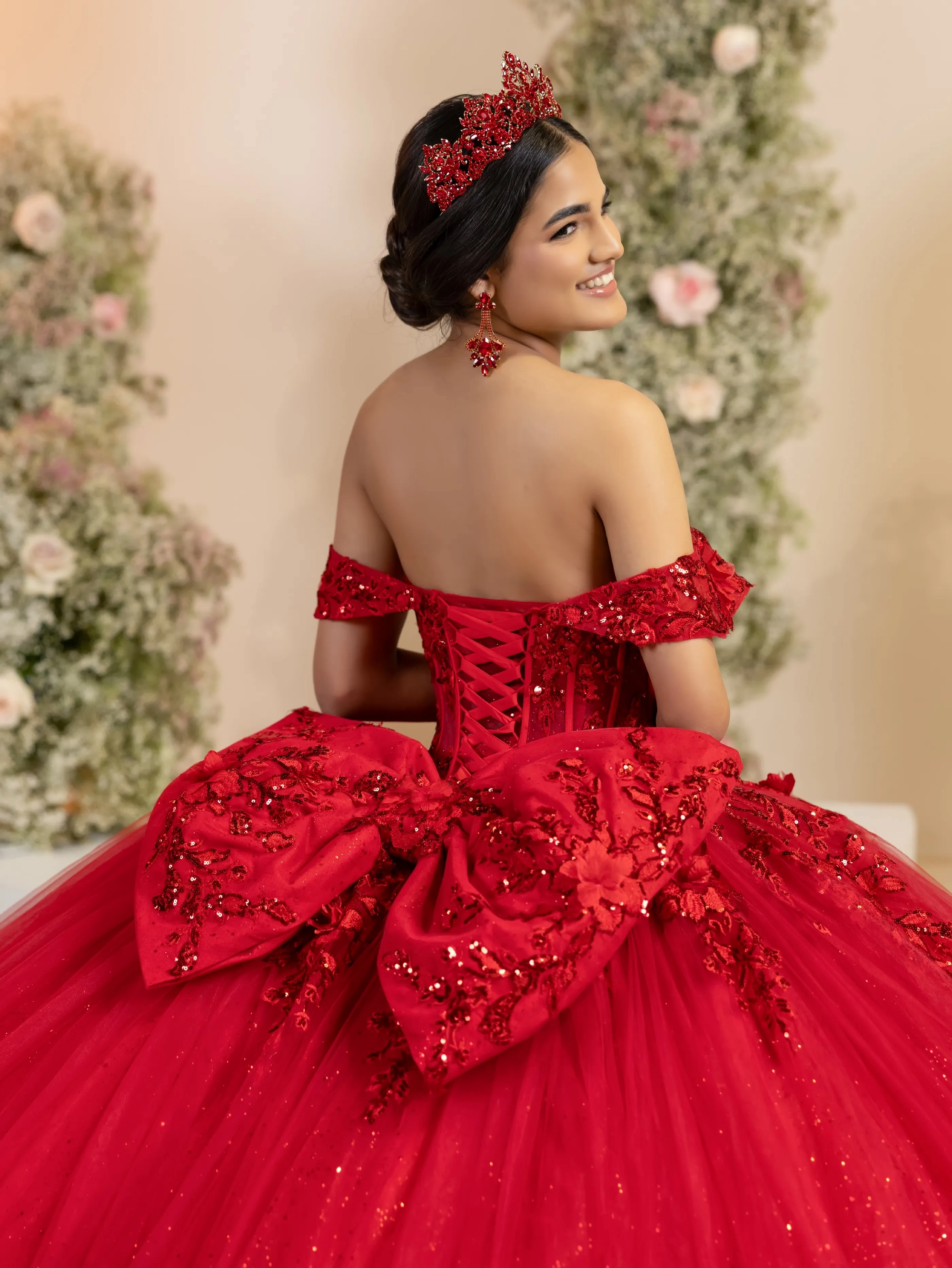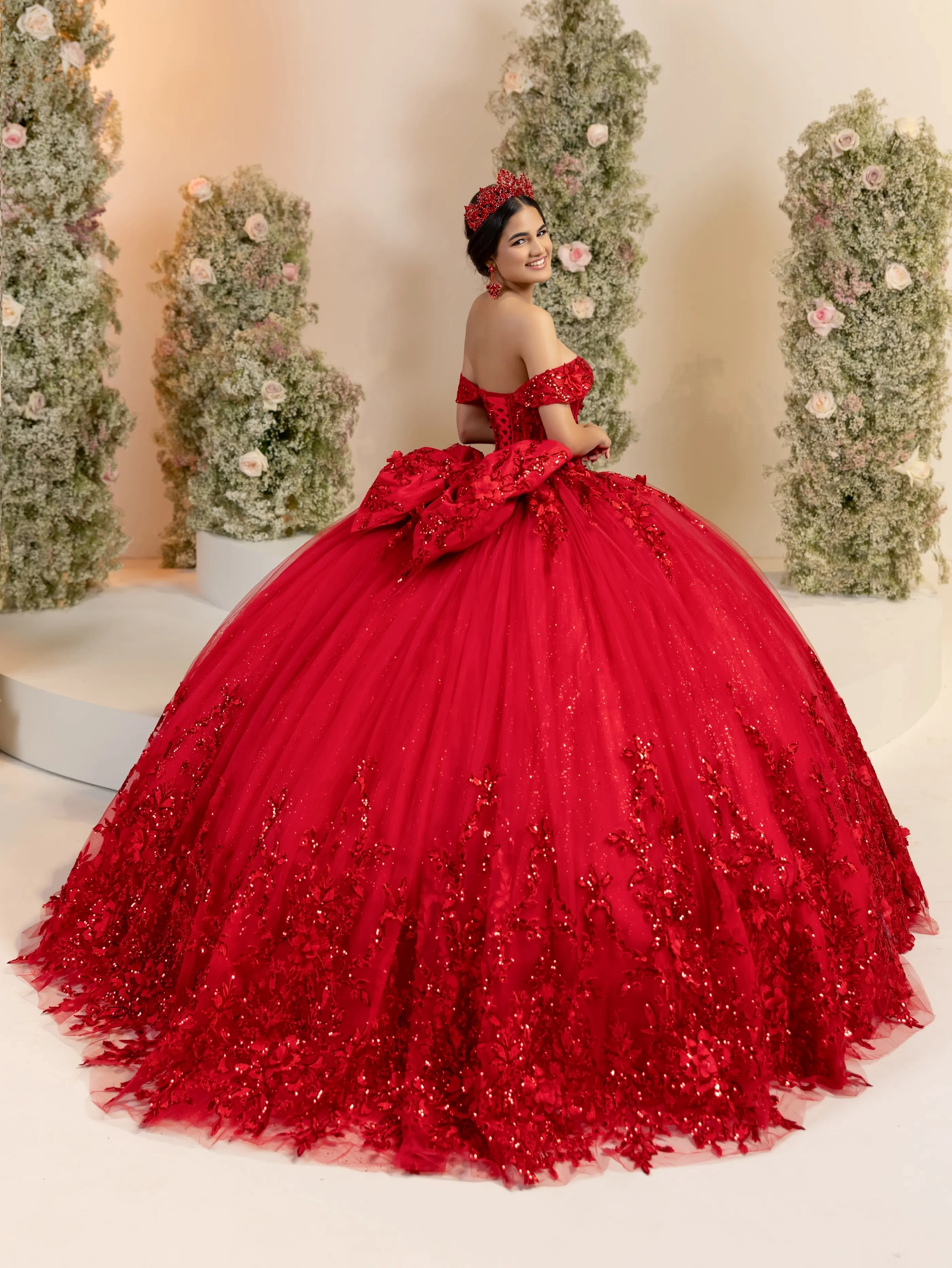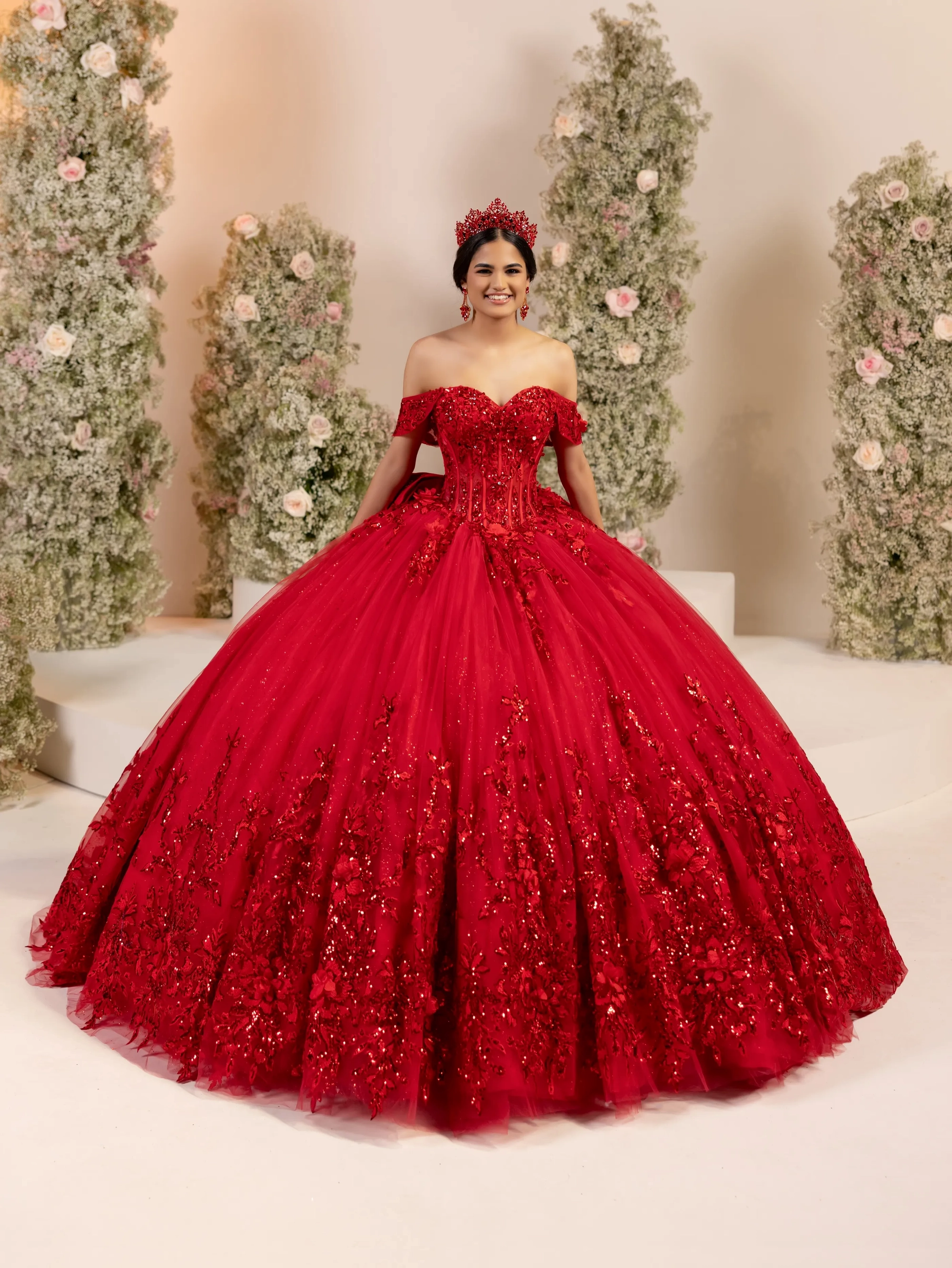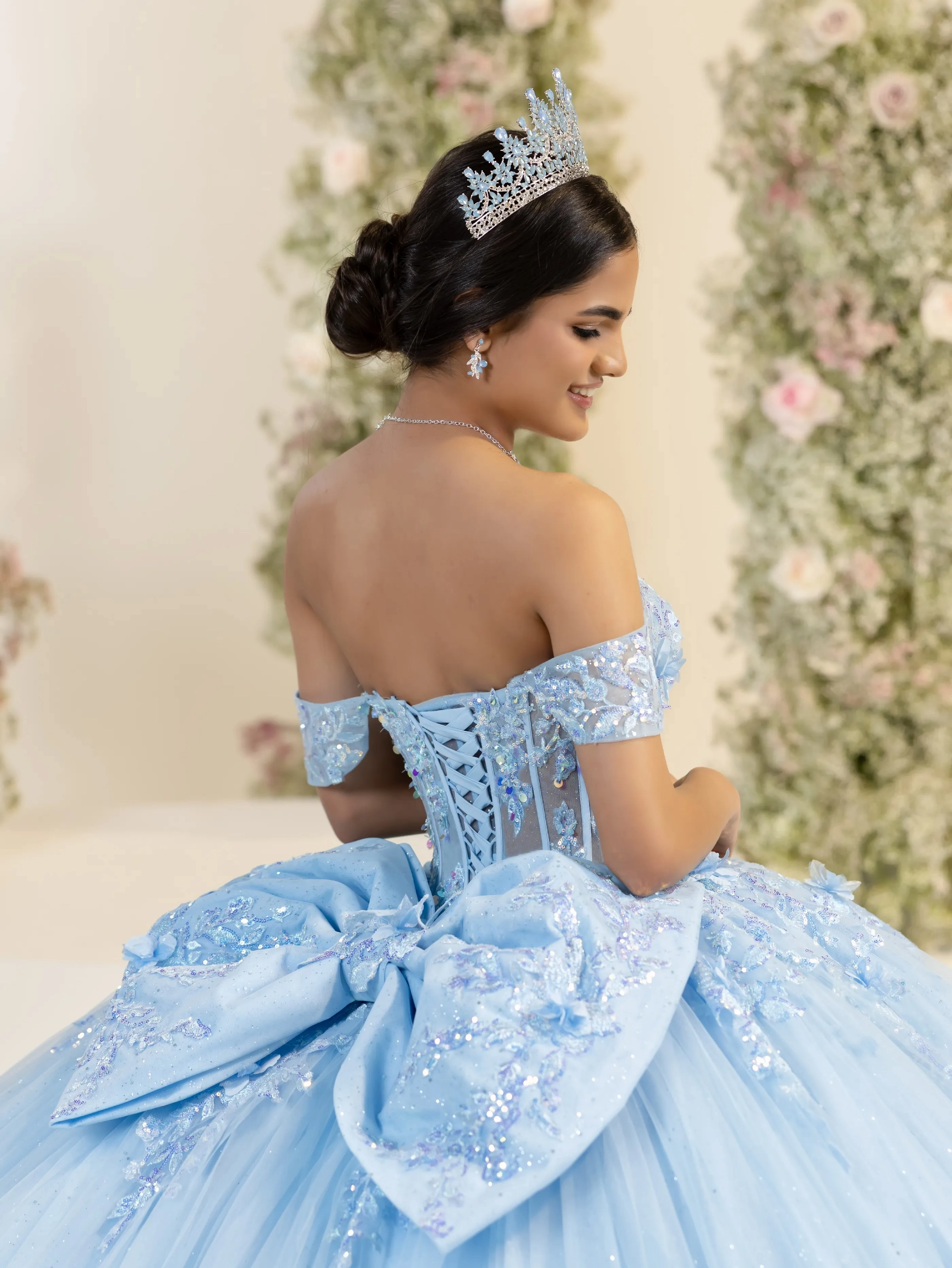 Off-the-shoulder sweetheart neckline adorned with 3D embroidery lace and fitted corset-style sheer bodice, heavily vertical border lace throughout out the voluminous chapel length tulle skirt.